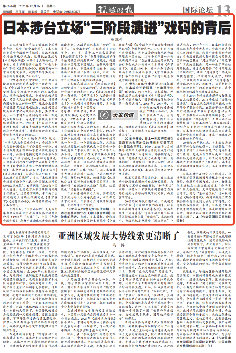 20世纪90年代以来,日本在大力推进军事外向化的过程中,不断弱化“台湾属于中国”立场并制造“台湾地位未定”论调,先是为自卫队对美军干预提供后勤支援寻找借口,后又试图为其直接武力干预台海赋予“合法性”。高市早苗近期的涉台错误言论,正是这种野心的暴露。